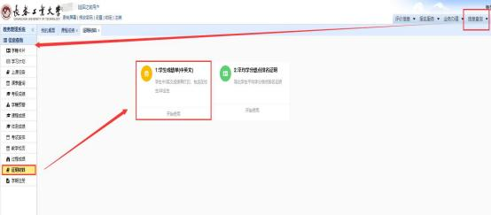 1.学生进入系统后,点击右上方 “信息查询”,在左侧 任务栏中选择证明材料,点击 学生成绩单(中英文)”模块(目前仅开放中文成绩单)。