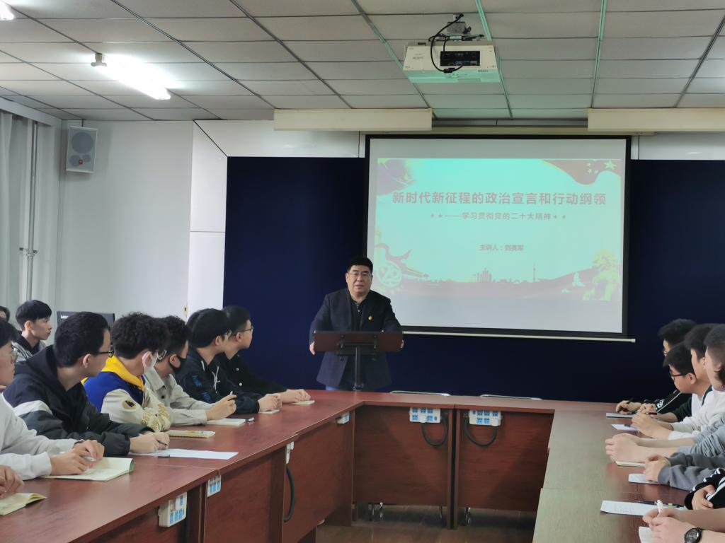 刘英军指出,党的二十大是一次高举旗帜、凝聚力量、团结奋进的大会,是在我们党成功走过百年奋斗历程、又踏上新的赶考之路的关键时刻召开的一次重要会议。全院师生要提高政治站位,把学习宣传贯彻党的二十大精神作为当前和今后一个时期的首要政治任务和头等大事,入党积极分子要端正入党动机,坚定理想信念,全面贯彻习近平新时代中国特色社会主义思想,把思想和行动统一到党的二十大精神上来,把智慧和力量凝聚到党的二十大确定的各项任务上来,踔厉奋发、勇毅前行,敢于担当、积极作为。