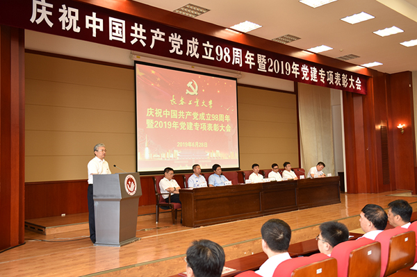 本网讯(通讯员 王权 李强)6月28日,学校在学术报告厅召开庆祝中国共产党成立98周年暨2019年党建专项表彰大会。学校领导、党委常委,全体中层干部、受表彰集体和个人代表、全体教职工党支部书记、专兼职组织员、党务秘书参加了会议。党委副书记、校长张会轩主持大会。