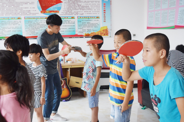 大学生志愿者教孩子们打乒乓球