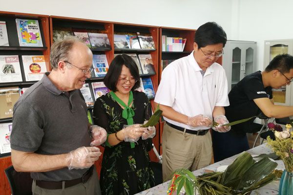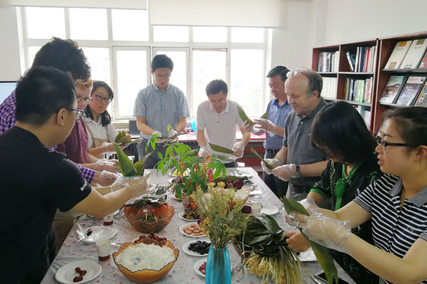 本网讯(通讯员 王权)6月11日,在中国传统节日端午节到来之际,Beat365中文官方网站举办迎端午“粽香传真情”包粽子活动。副校长李占国及外籍教师应邀参加,大家一起在欢声笑语中包粽子迎佳节,其乐融融。