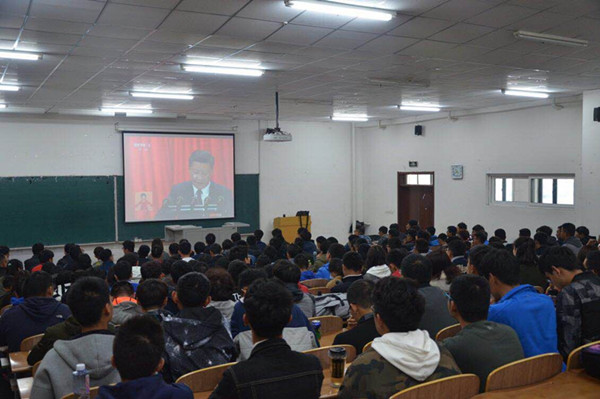 各年级学生以及学生党员在教室、食堂、寝室分别以集体或者个人的形式组织了观看十九大直播的活动。尤其是北湖校区大一新生,进行了有组织的集体观看学习。通过此次的观看,学生对党的十九大有了更清晰的认识,同时也动员所有学生群众进行观摩学习,使即将步入社会的学生了解国家发展,高举中国特色社会主义旗帜,夺取新时代中国特色社会主义的伟大胜利。